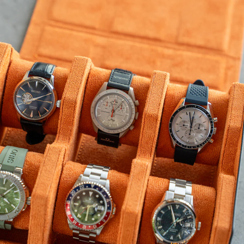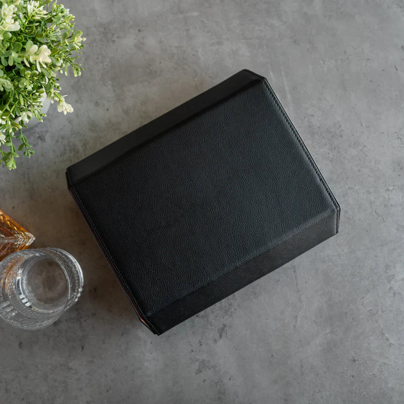 A perfect mix between a watch roll and a watch box. Introducing our watch box for 6 watches with removable cushions for each individual watch using a sliding system. It's specifically designed for watch enthusiasts and watch collectors to protect their prized possessions - whether it is for traveling or to store it at home. The Watch Box is hand made of fine black genuine leather and holds up to six watches.
