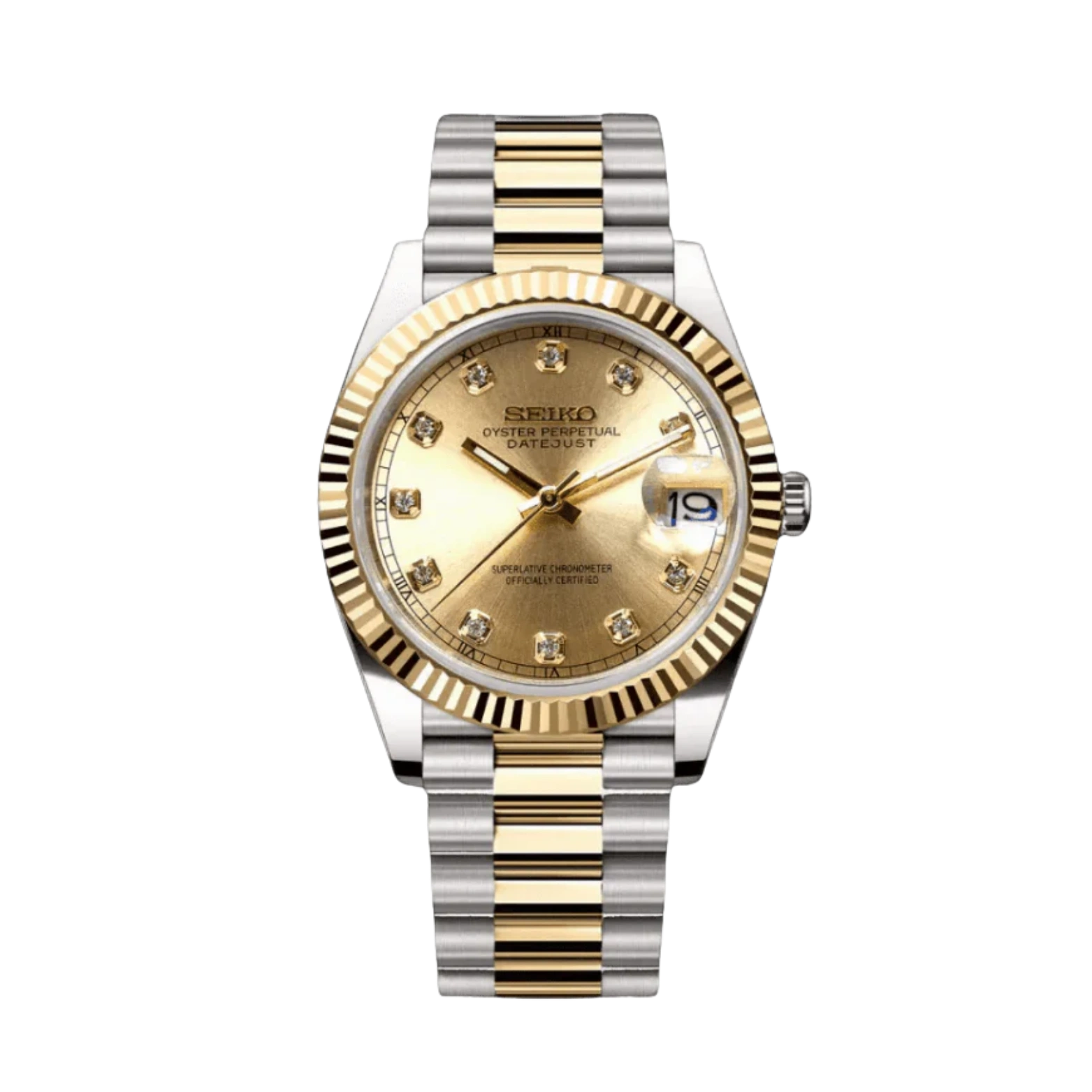 Discover the Seiko Mod Datejust Two-Tone Gem Gold, a meticulously crafted NH35 Automatic Watch, inspired by the iconic Datejust design. This elegant timepiece features a Gem Gold aftermarket dial, encased in a 36 mm or 39 mm fluted bezel, offering a blend of style and precision for watch enthusiasts.
