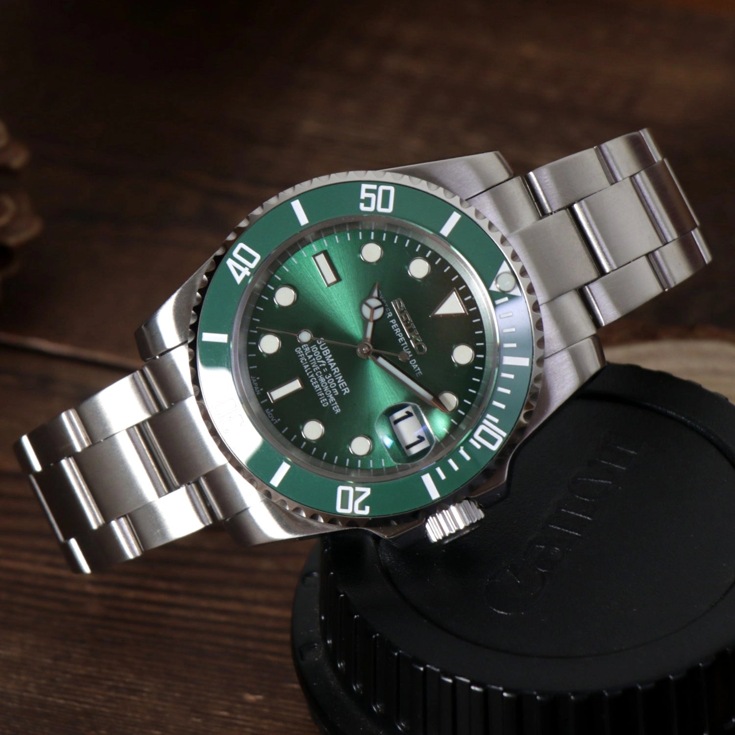 Inspired by the iconic Submariner design, and featuring the prestigious Seiko NH35 automatic movement, we present the Seiko Mod Submariner Hulk. A 40 mm high-end quality watch combining the perfect alliance between excellence and accessibility. Carefully hand-assembled by experts with the next features: