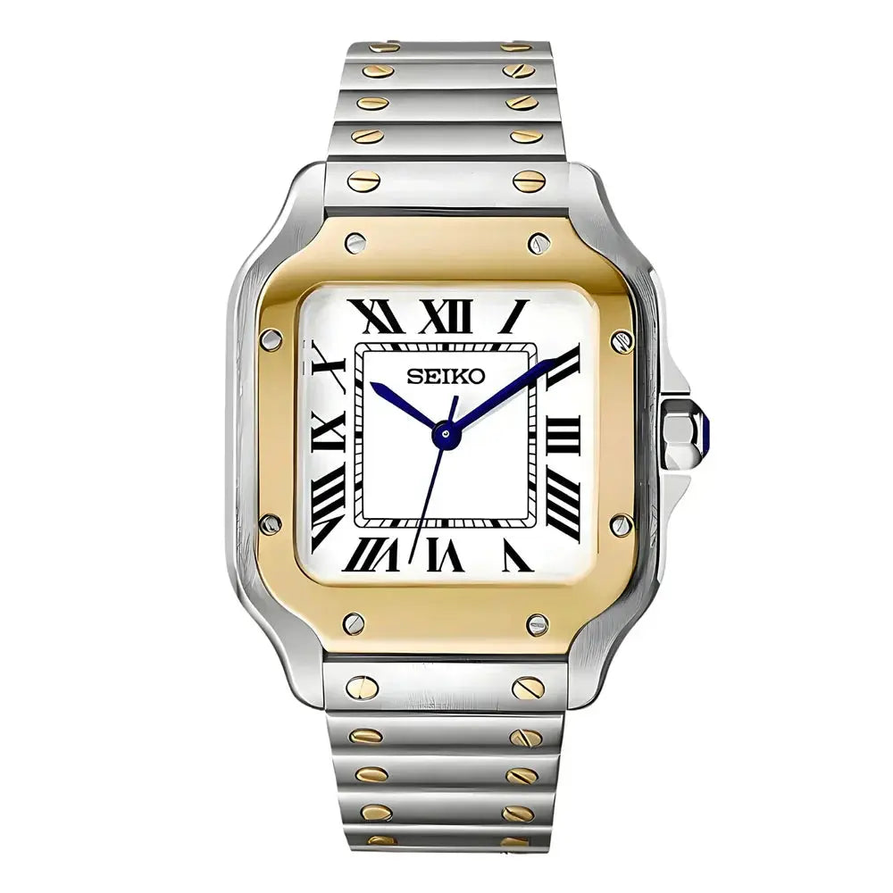 Inspired by the iconic Santos design, and featuring the prestigious Seiko NH35 automatic movement, we present the Seiko Mod Santos.